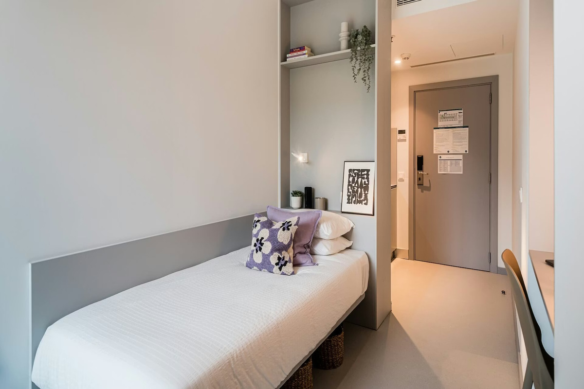 F Building provides fully furnished single rooms with private kitchenettes and shared sanitary facilities, supported by on-site laundry access, maintained common areas, and secure resident-only entry. Everything is set up for practical day-to-day living while staying close to classes and campus resources.